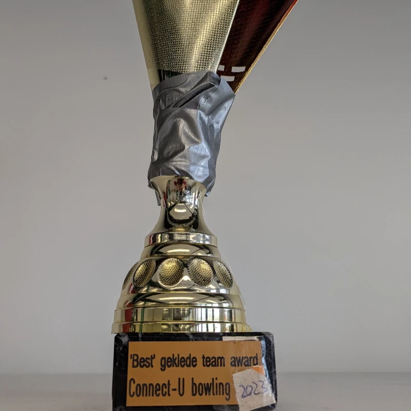 Helaas heeft de trofee wat schade opgelopen tijdens een nachtelijk skateboard-incident. Maar geen zorgen, met wat ducttape en secondelijm staat 'ie weer als een koning op zijn troon!